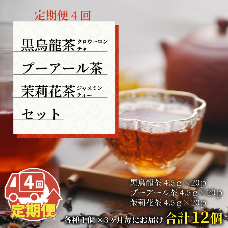 商品詳細 名称 【ふるさと納税】【定期便4回コース】 黒烏龍茶・プーアール茶・ジャスミンティー ティーバッグ 3種セット × 4回 内容量 【年4回お届け】 下記の3種類セットを1年に4回(3カ月に1回)お届けします。